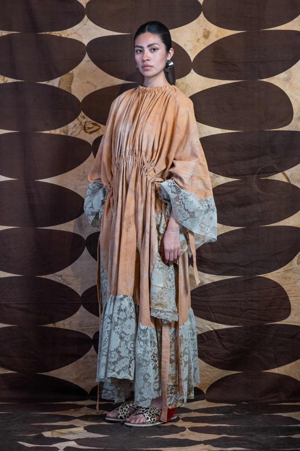 Vestido amplio de corte rectangular con frunce elástico en el cuello y la cintura + sistema de tiras ajustables en hombros y laterales. Abertura lateral inferior y olanes de encaje (variables según disponibilidad de encaje)